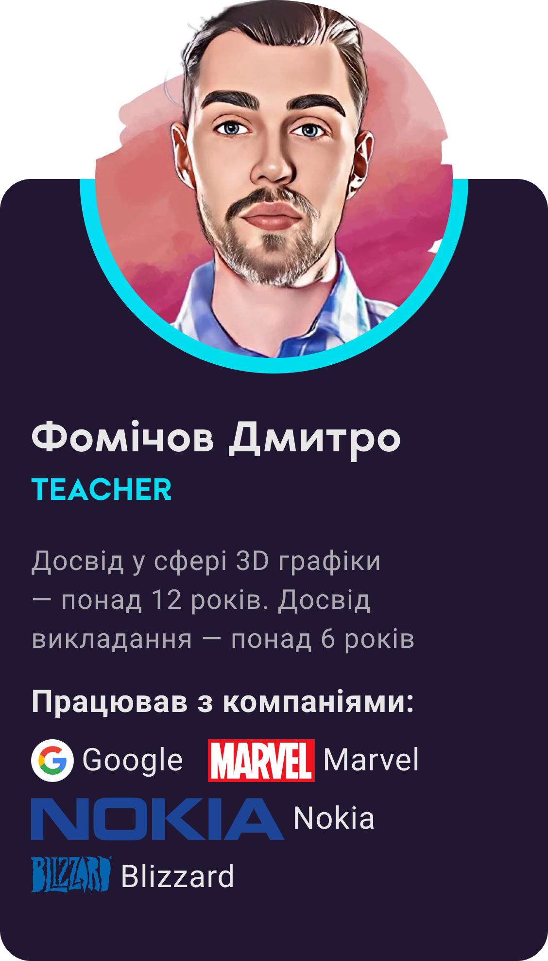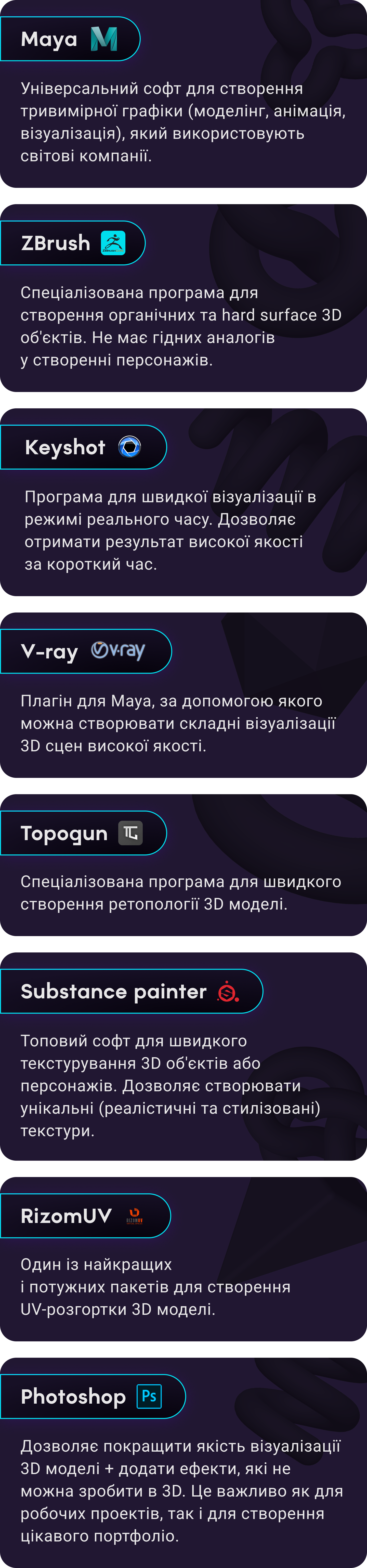 3D художник - це спеціаліст який працює у Gamedev, кіно або медіа. Створює тривимірнy комп'ютерну графіку за допомогою програм Maya, ZBrush, Substance painter. Гарний спеціаліст може заробляти від 3000$